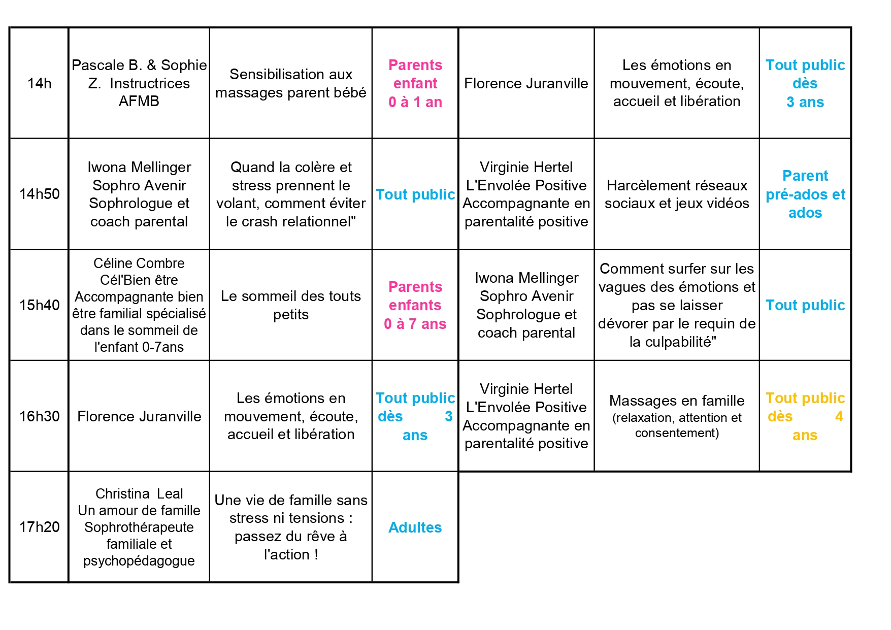 Au Programme: 2 jours pour échanger, s’informer sur des thèmes aussi variés que allaitement, le langage des signes avec les bébés, le sommeil des bébés, la gestion des conflits avec des plus grands, parler des premières règles, les émotions , le harcèlement…